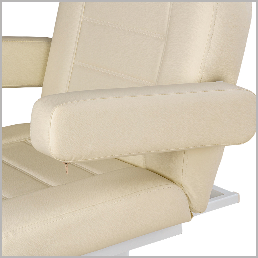 Прочный металлический каркас с пластиковой облицовкой в нижней части гарантирует устойчивость и надежность конструкции. Наличие съемных элементов (подлокотников и подушки) делает кресло универсальным и практичным в использовании. В горизонтальном положении эта модель может выполнять функцию массажного стола.
