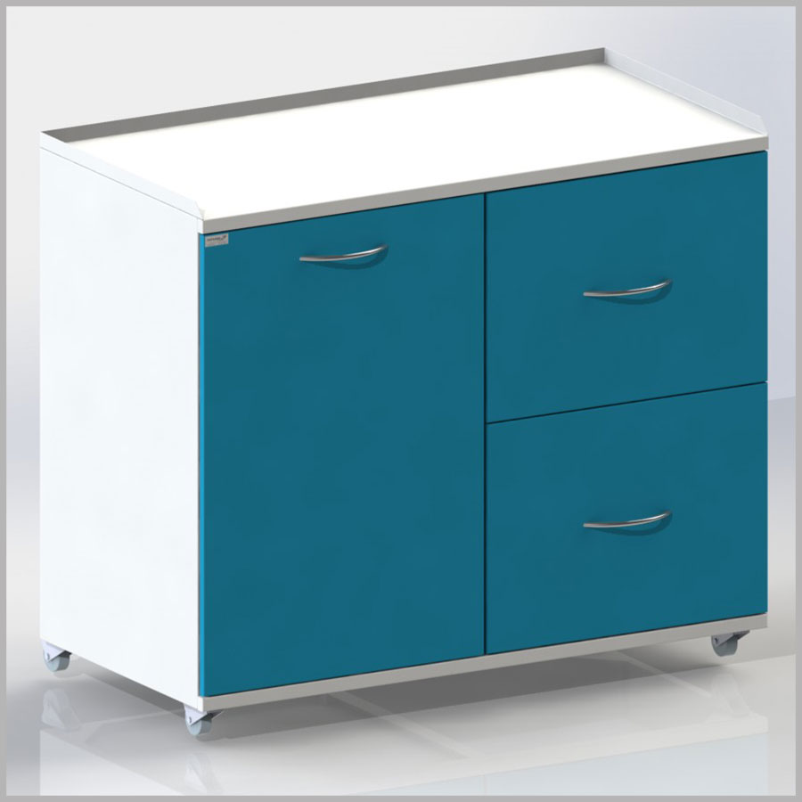 Передвижная тумба распашной дверью с двумя металлическими полками, двумя выдвижными ящиками, сверху столешница, сбоку ручки.