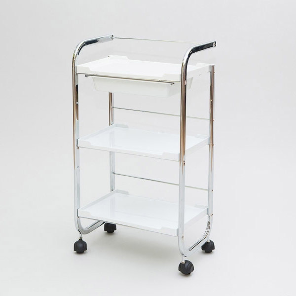 Многофункциональные полки и выдвижной ящик для размещения оборудования, инструментов и косметических средств в количестве трех штук способны выдержать большие нагрузки. Сверху имеется ручка, которая обеспечивает удобное перемещение тележки.