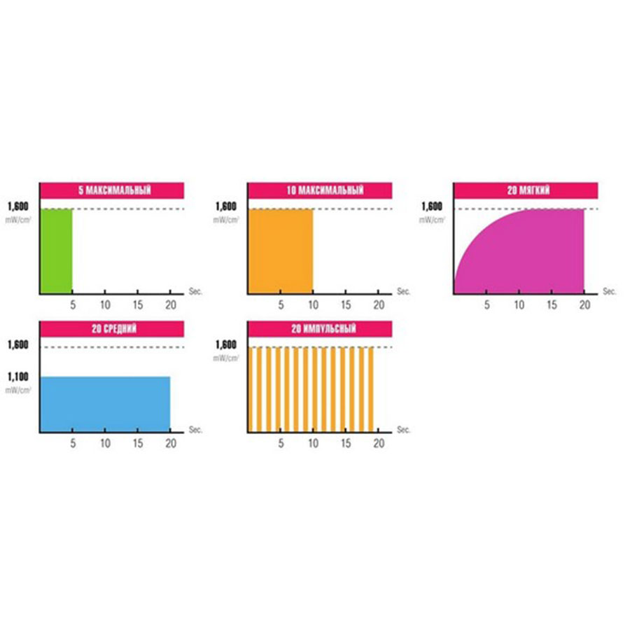 Высокая интенсивность 1600 мВт/см2 обеспечивает быструю и надежную полимеризацию — возможен выбор ультракороткого засвечивания - не более 5 секунд.