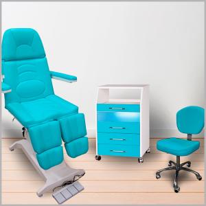 В комплект кабинета входит: 1. Кресло ФУТПРОФИ-2 с двумя моторами. 2. Стул мастера МАРК. 3. Шкаф педикюрный СМАРТ-1.