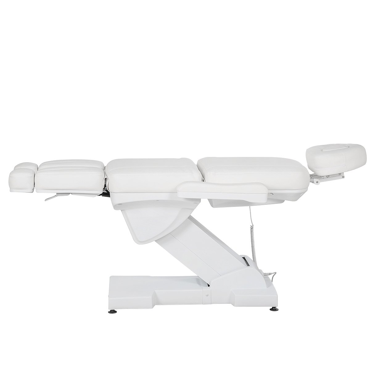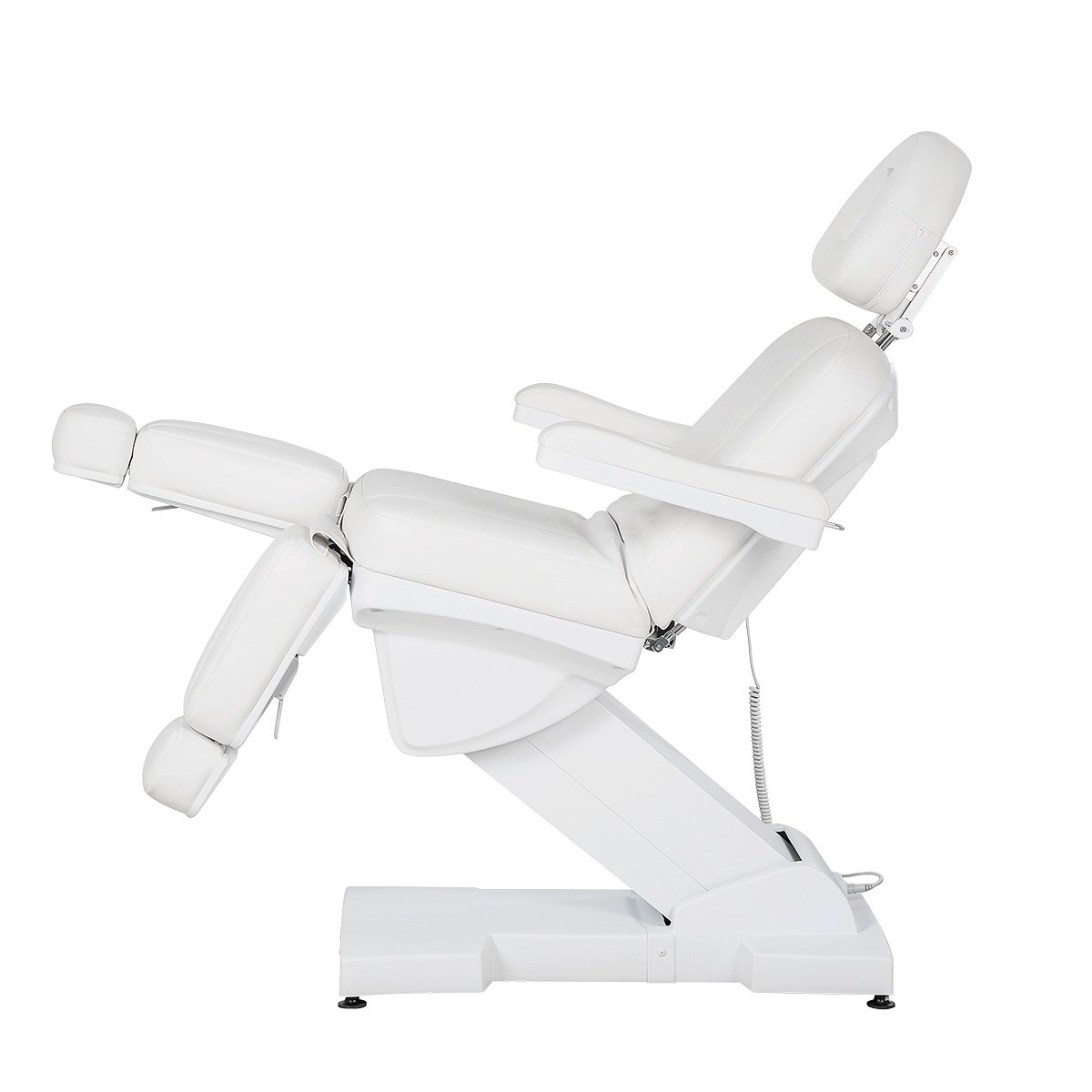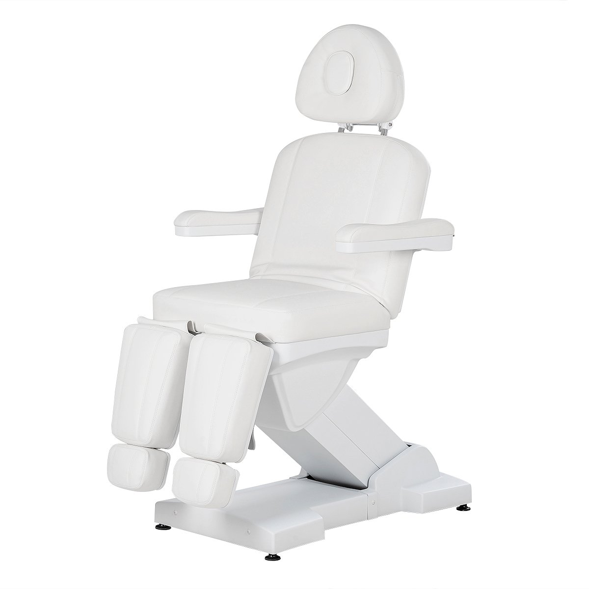 - Кресло для педикюра: каркас из прочного металла, покрытого защитной порошковой краской белого цвета, мягкие детали из поролона с эффектом памяти, обивочный материал – экокожа высокого качества, мягкие элементы под ноги с выдвижными подпятниками, съемные подлокотники, подголовник с вырезом для лица и съемной подушкой, электропривод (3 мотора) с пультом управления