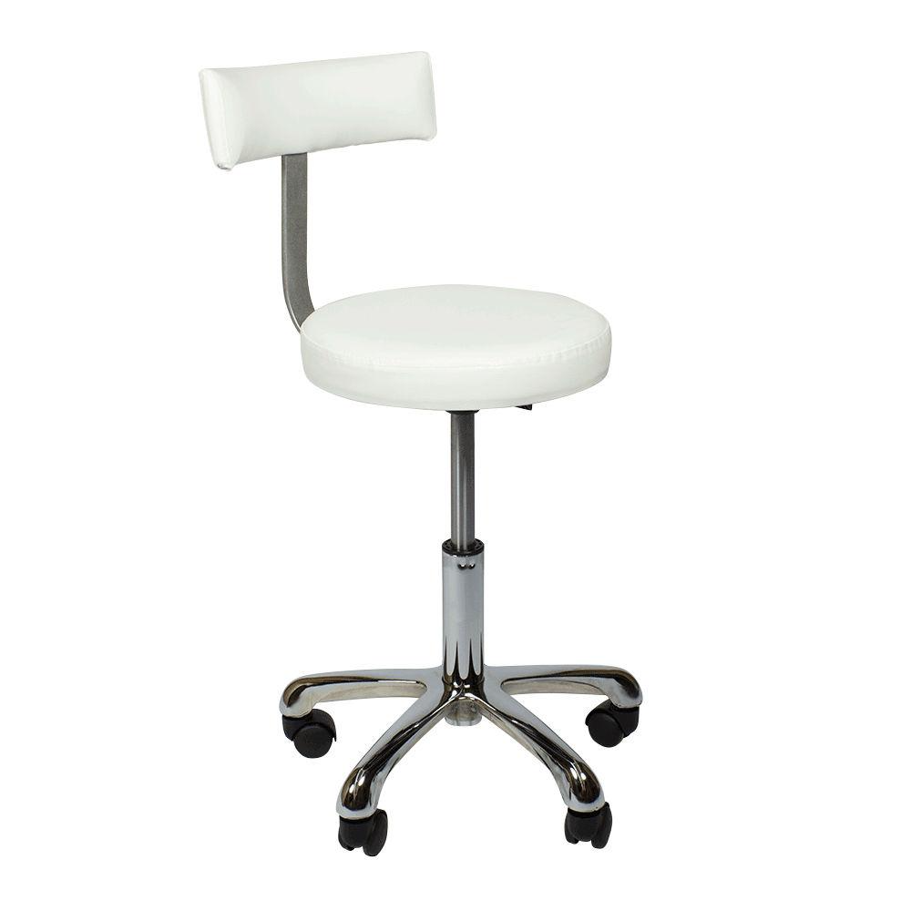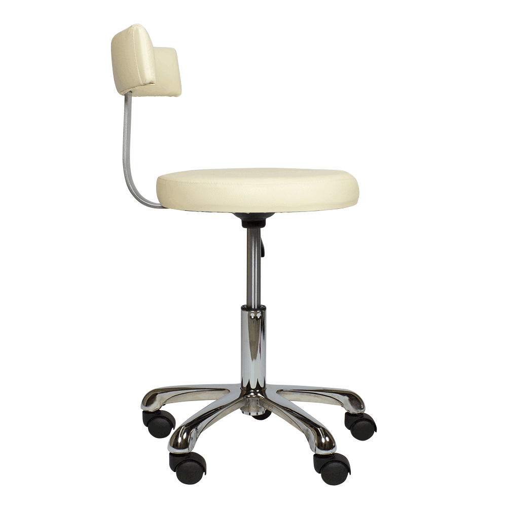 - Стул мастера по педикюру: модель комплектуется эргономичным сиденьем круглой формы и высокой анатомической спинкой, которые соединены между собой надежным каркасом из полированного металла, обивочный материал – влагоустойчивая экокожа, основание – пятилучье из прочного хромированного металла, установленого на легко вращающиеся пластиковые колеса, по высоте регулируется пневматикой.