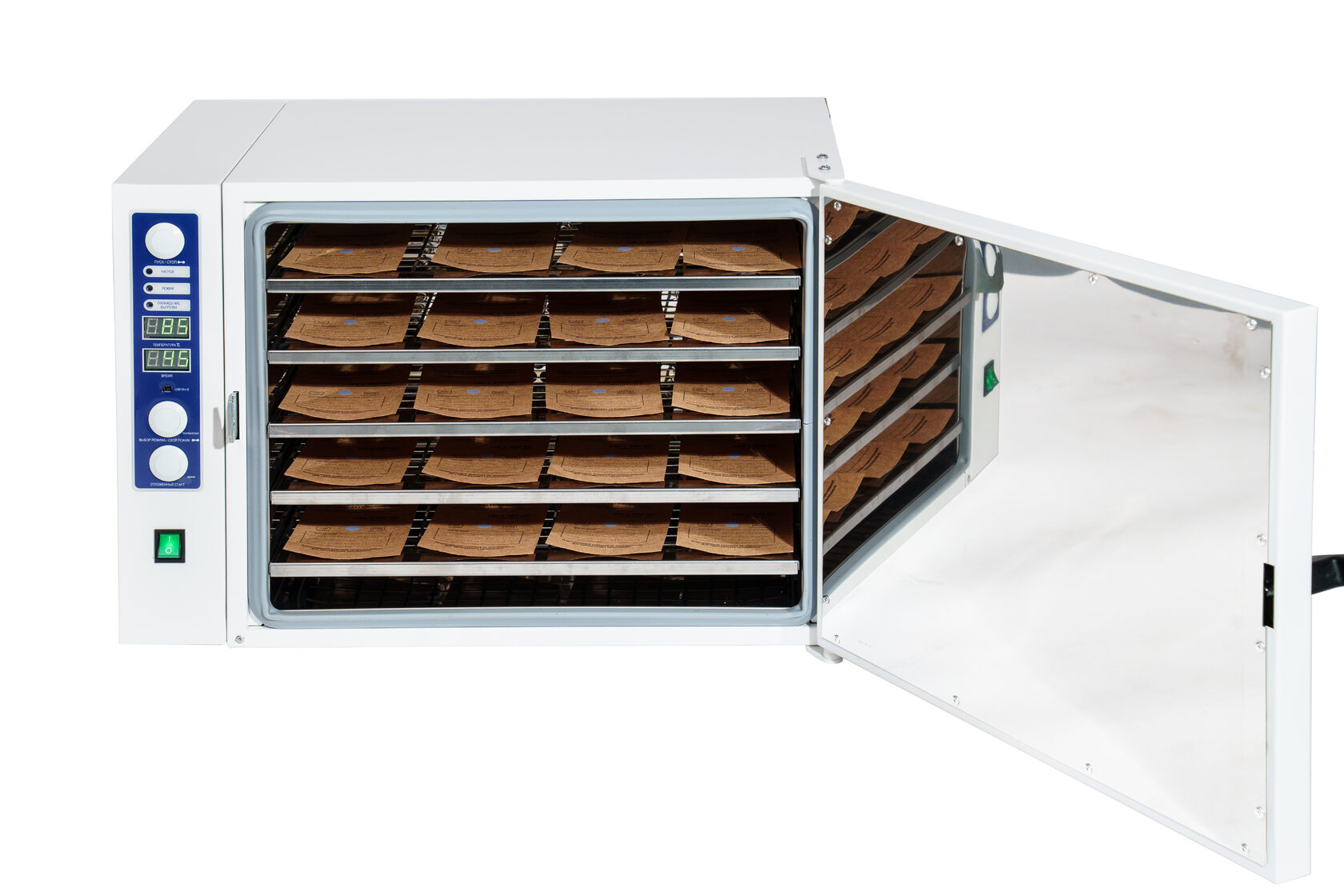 Стерилизационная камера разработана методом компьютерного моделирования, с целью достижения максимального нагнетания воздуха, что позволяет располагать инструмент в стерилизационной камере на 5 полочках одновременно.