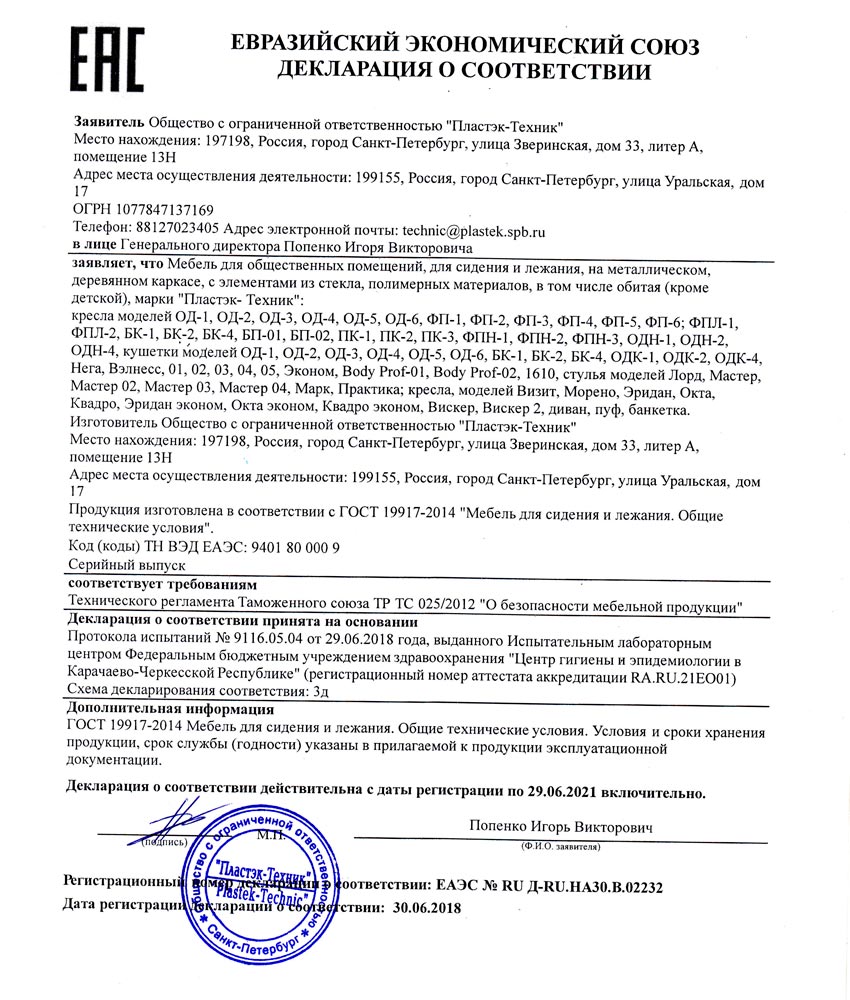 Обивка стула ‒ экокожа (Германия) по каталогу, экологически чистый материал, устойчивый к дезинфицирующим растворам.